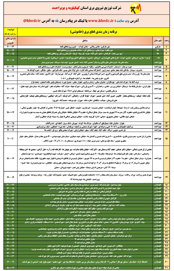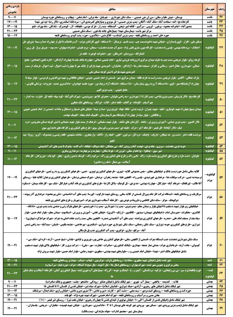 جدول خاموشی های استان کهگیلویه و بویراحمد در روز دوشنبه